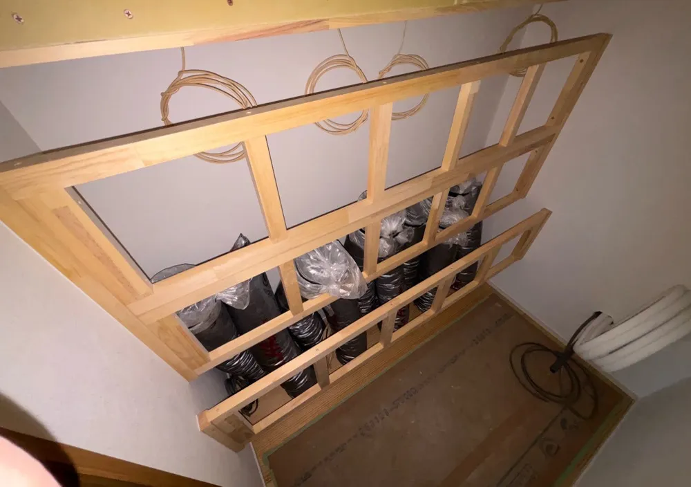 この枠の一つ一つに送風ファンを取り付け、ダクトを繋げて各部屋に空調室の空気を送ります。