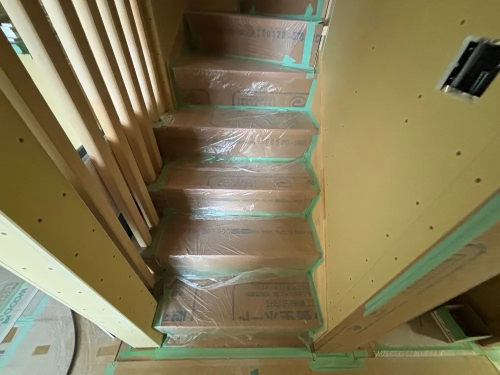 現場の写真をご覧いただくとお分かりいただけるかと思いますが、階段の一段一段に丁寧に養生シートが貼られています。木製の階段は特に傷がつきやすいため、このような細やかな配慮が欠かせません。