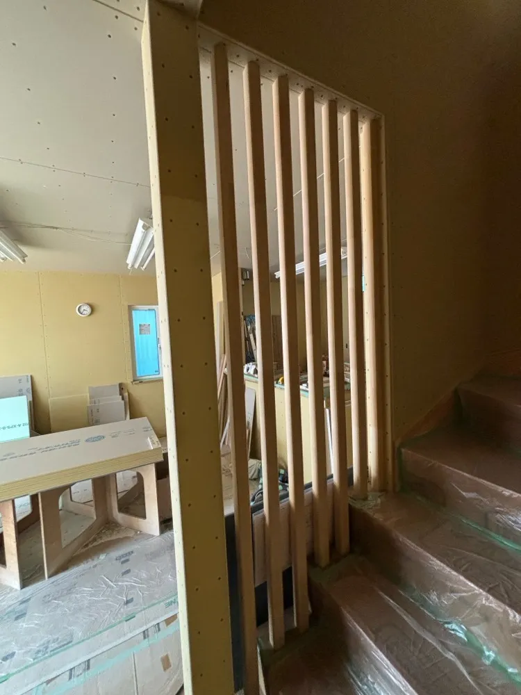 今回は特に、こだわりのデザイン要素である「階段の飾り柱」と、職人の丁寧な仕事ぶりが表れる「養生の徹底」。
