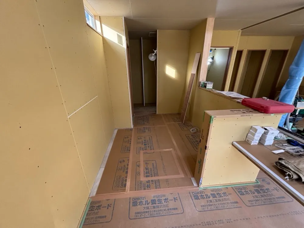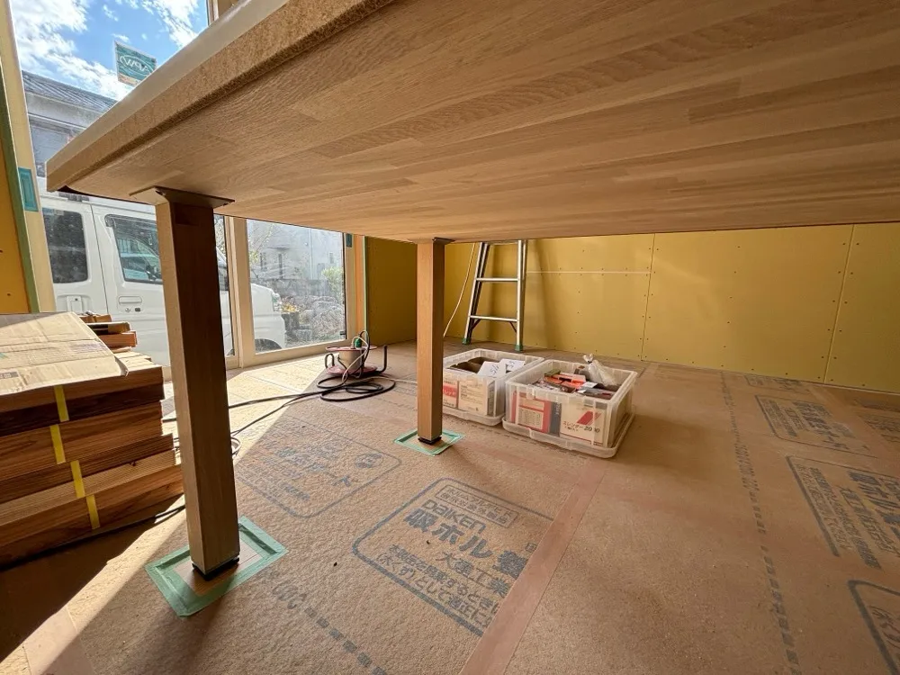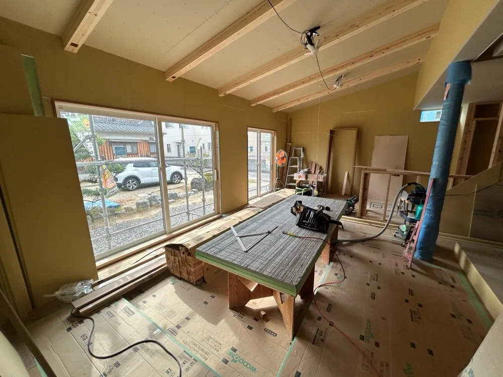 現在は下地ボード(写真の黄色い部分)が張られていますが、この空間を支える梁や、今後仕上げられていく壁の素材一つひとつに、お施主様のこだわりが反映されています。