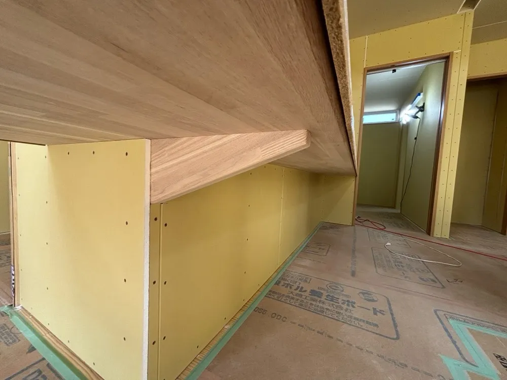 現場で組み立てが進んでいるのは、お施主様と打ち合わせを重ねてきた造作カウンターテーブルです。