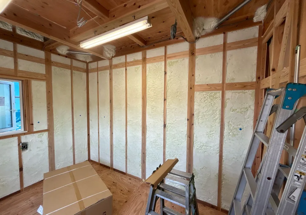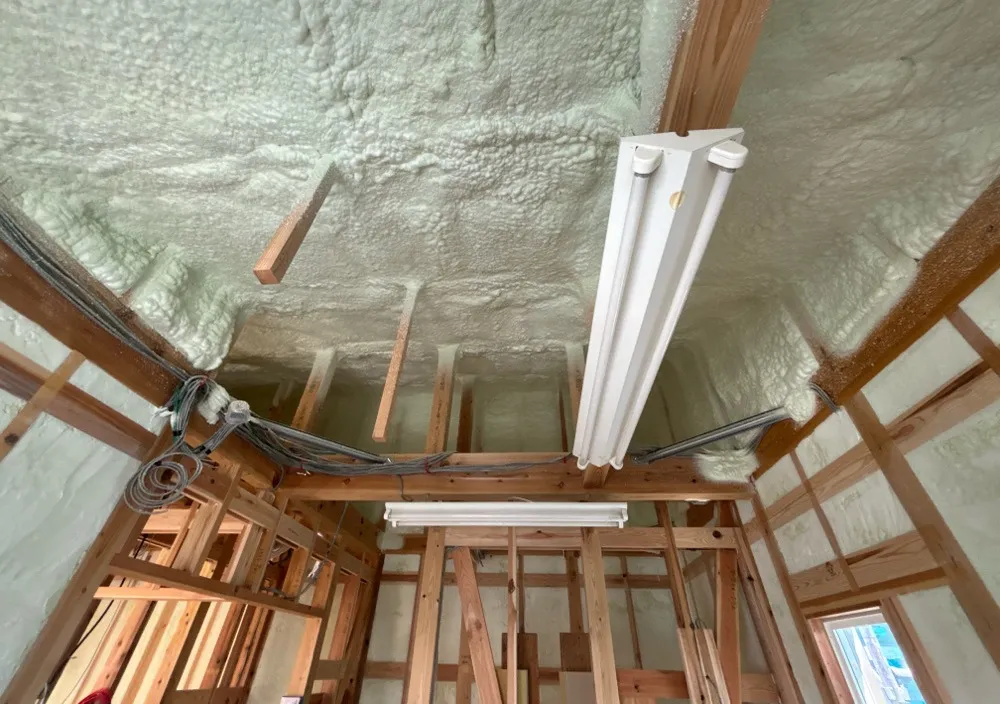壁も天井も、隙間なくアクアフォームで覆われています。この後、石膏ボードを貼り、クロスを貼れば、この白い断熱材は完全に見えなくなります。