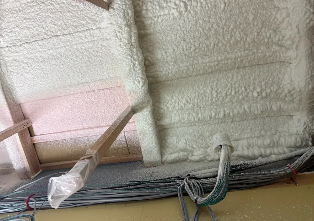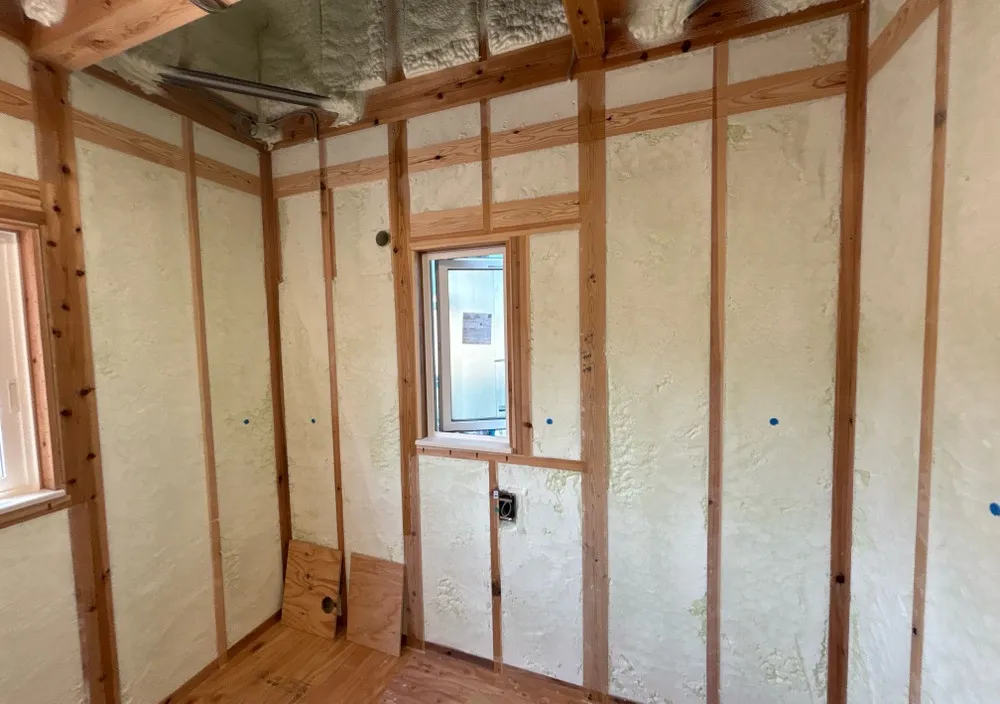 今回の現場では、特に気密性能を重視し、日本アクア株式会社の「アクアフォーム」という発泡ウレタン断熱材を採用しました。現場で直接吹き付けて発泡させる、硬質ウレタンフォームです。