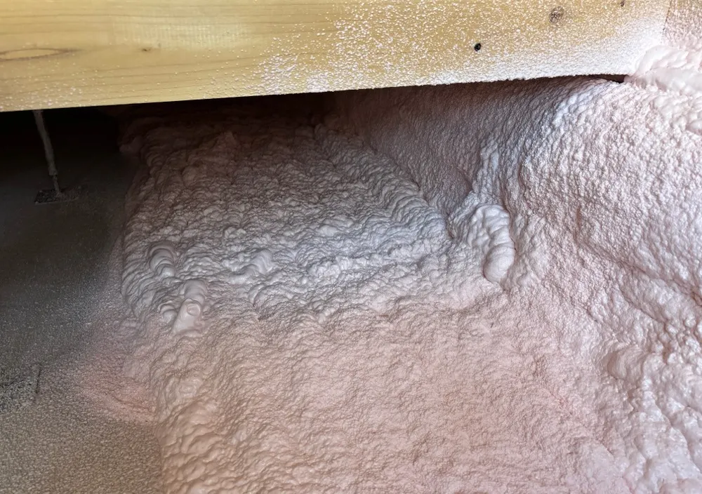 こちらは床下空間の断熱施工です。普段は絶対に見ることのない場所ですが、ここにもアクアフォームをしっかりと充填しています。