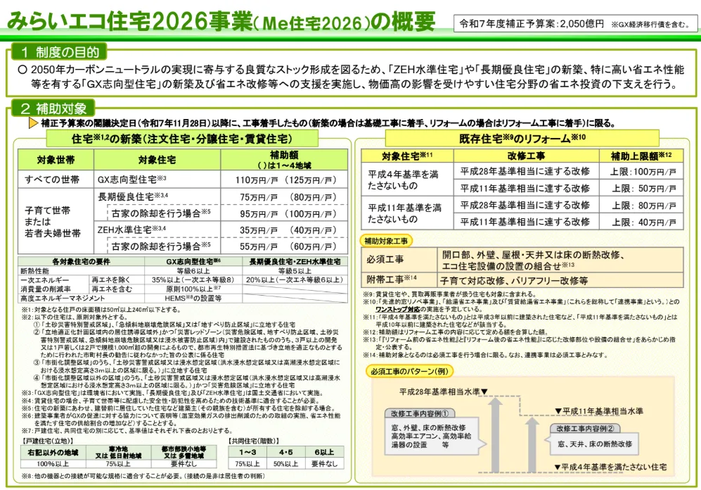 2026年度も、高性能な省エネ住宅を建てる方を後押しする国の補助金制度「みらいエコ住宅2026事業(Me住宅2026)」の予算案が閣議決定されました。