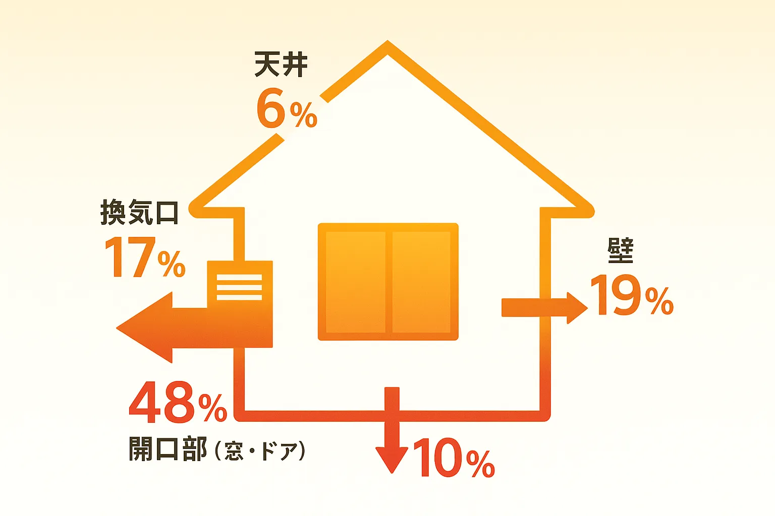 - 窓(約50%)-ガラスとサッシから最も多く熱が逃げる
